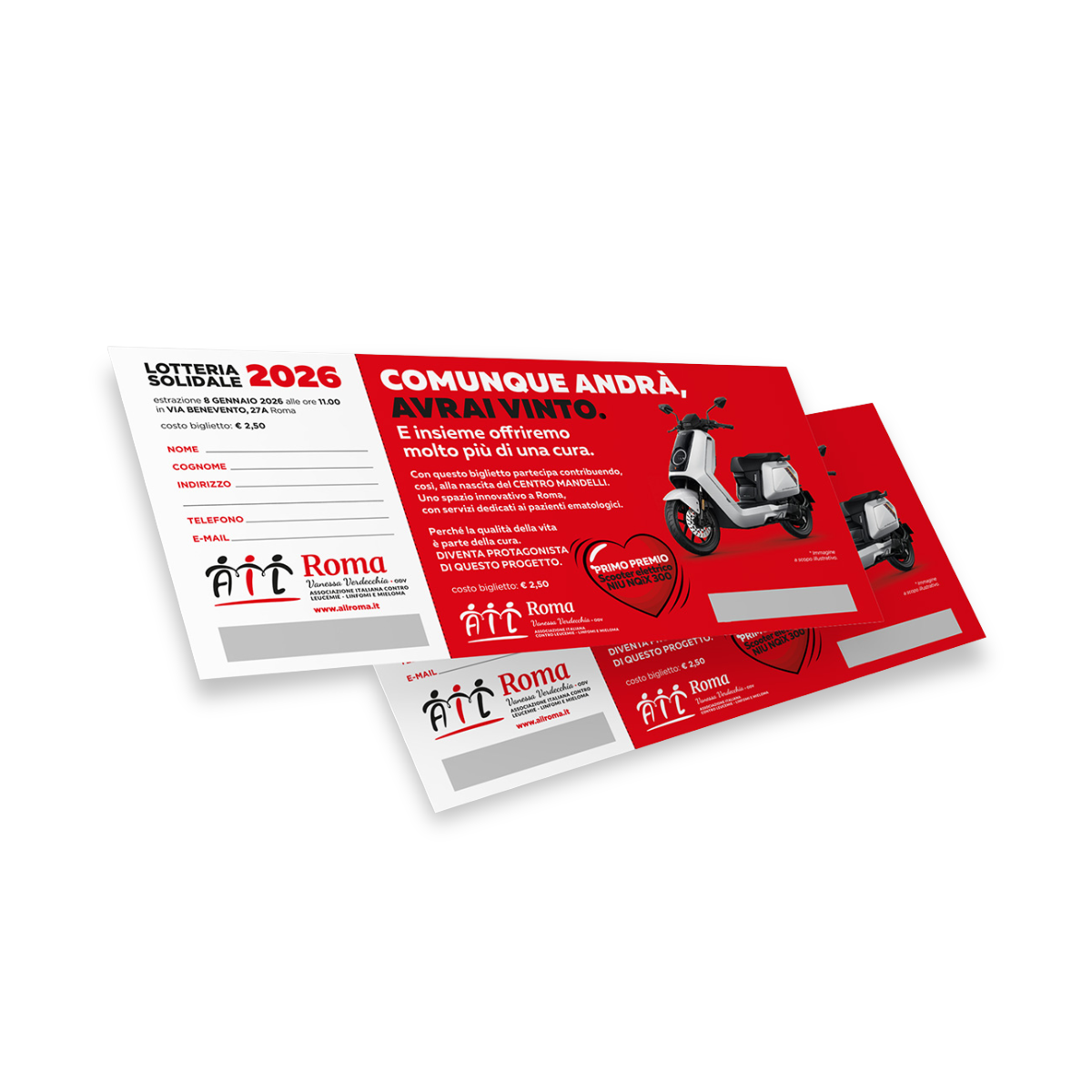 La ROMAIL Vanessa Verdecchia Odv– Sezione di Roma dell’AIL -Associazione Italiana contro le Leucemie, Linfomi e Mieloma, con sede legale a ROMA in Via ROVIGO, 1, organizza una lotteria di solidarietà denominata “Lotteria AIL ROMA Centro Mandelli” per finanziare la realizzazione di un «Centro multifunzionale» dedicato ai pazienti affetti da un tumore del sangue in cura a Roma e provincia. L’obiettivo è di realizzare un polo di servizi, erogati gratuitamente, che possano offrire risposte concrete e personalizzate ai bisogni dei pazienti integrando, in modo efficace e per tutto il percorso della malattia, i trattamenti ematologici cui sono sottoposti.