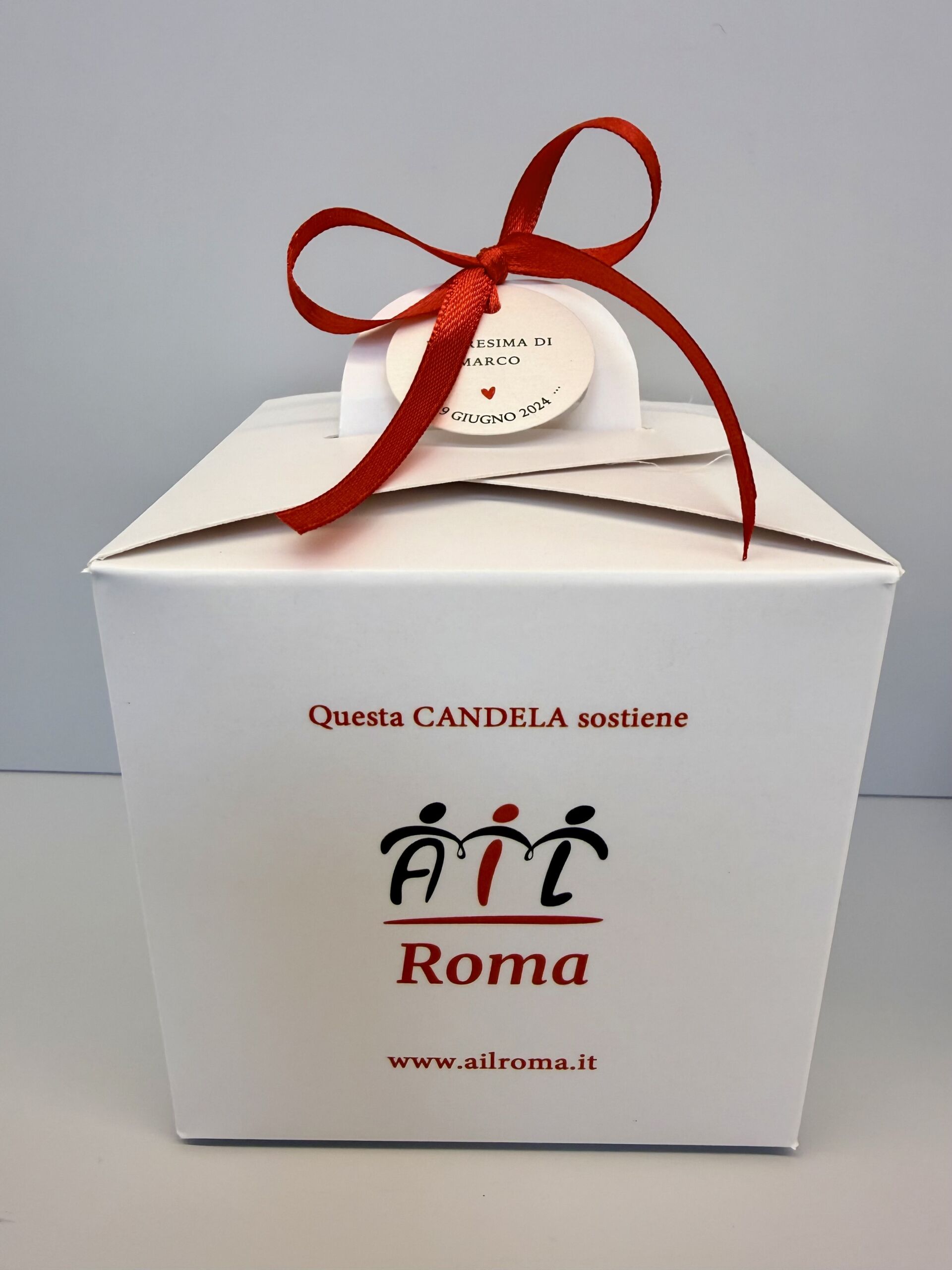 • Scatola bianca 10×10 cm con manico personalizzata sul fronte con la scritta “questa candela sostiene AIL Roma (logo dell’Associazione) e sul retro con la scritta “La ricerca illumina la speranza”.