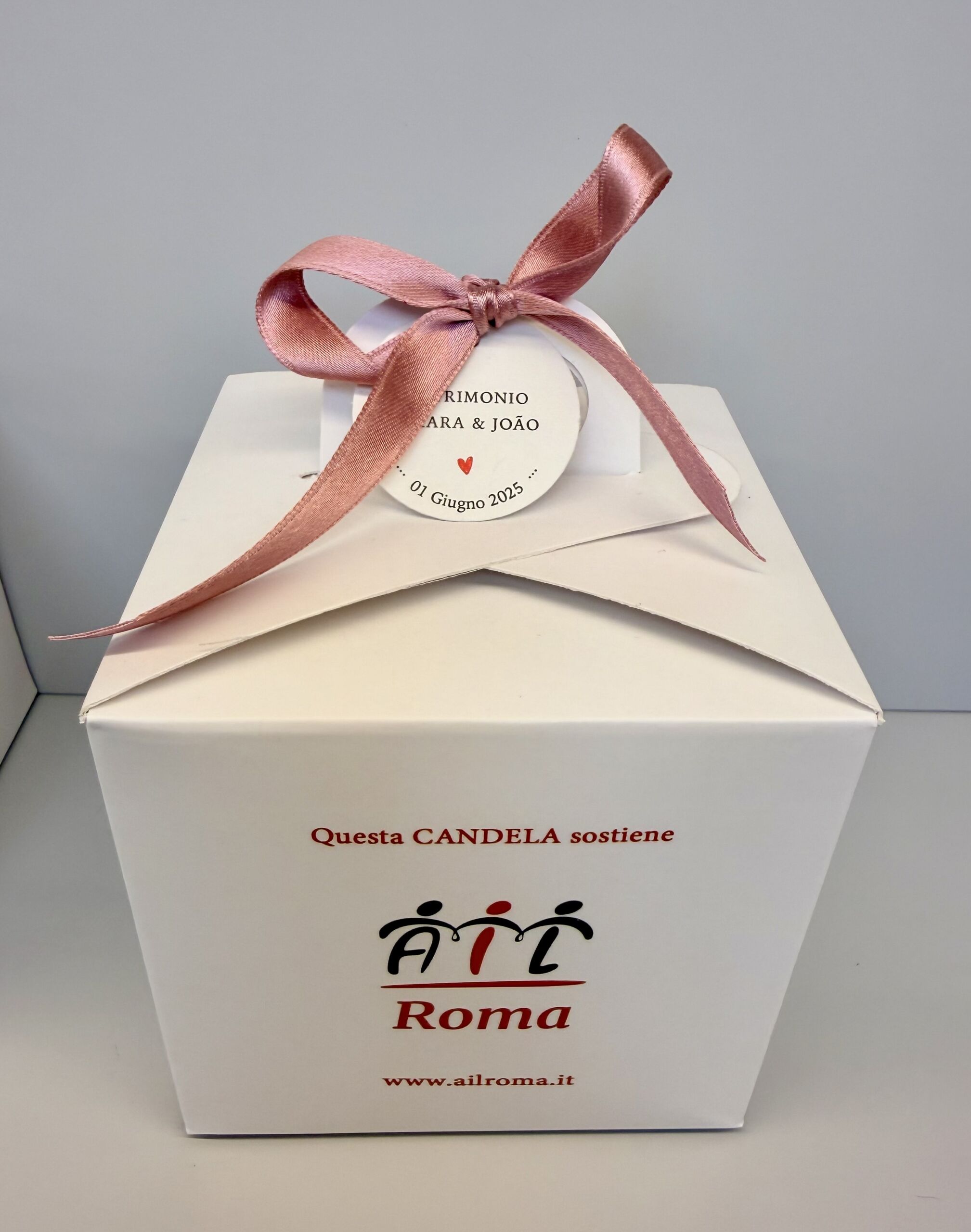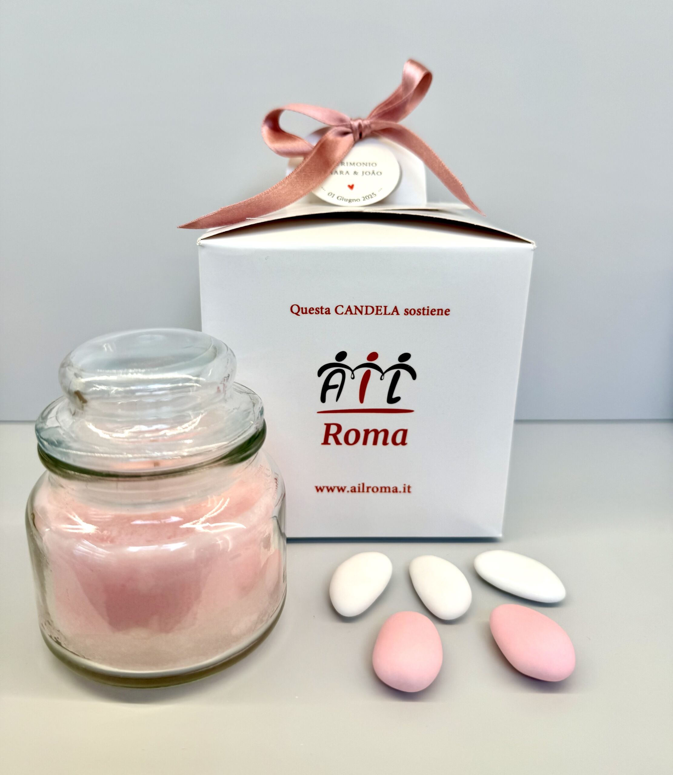 Candela in barattolo di vetro trasparente, con elegante coperchio, confezionata in scatola di cartoncino con logo AIL Roma e la frase “La ricerca accende la speranza”.