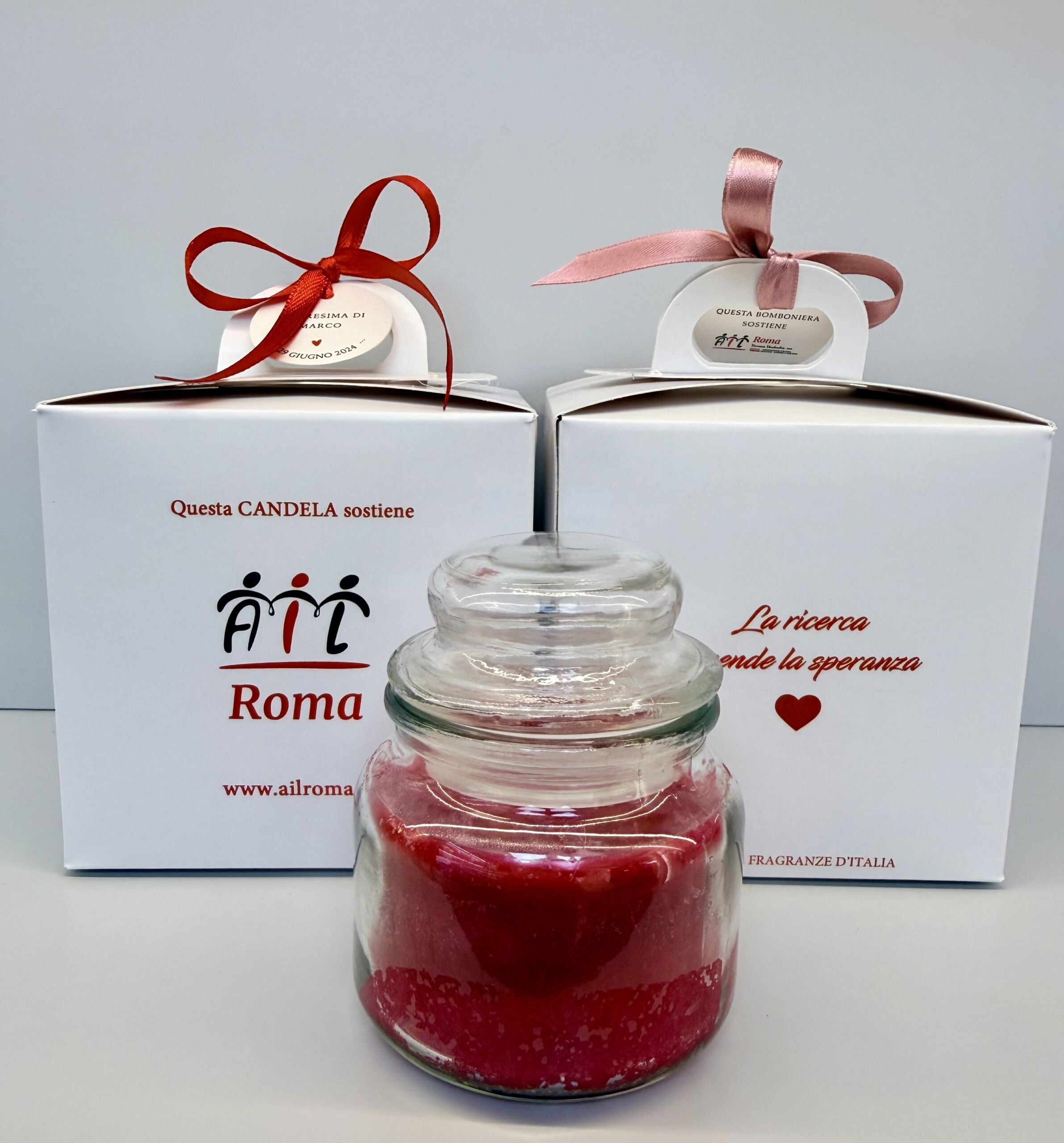 Candela in barattolo di vetro trasparente, con elegante coperchio, confezionata in scatola di cartoncino con logo AIL Roma e la frase “La ricerca accende la speranza”.