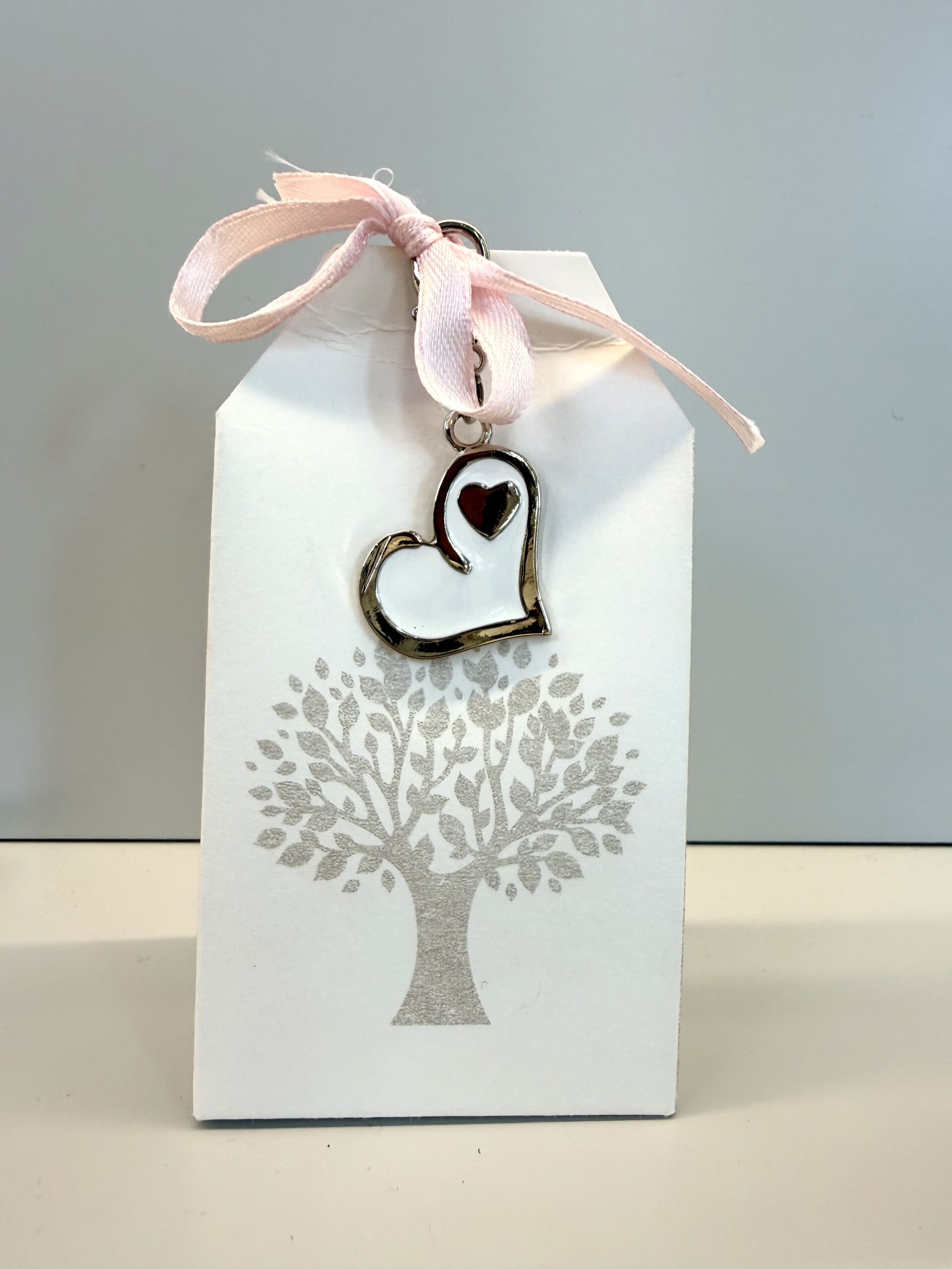 Charm a forma di cuore, in metallo lucido, con cuoricino inciso “AIL”. Ideale come accessorio per bomboniere, si puo aggiungere ad un sacchetto o ad una scatolina portaconfetti.