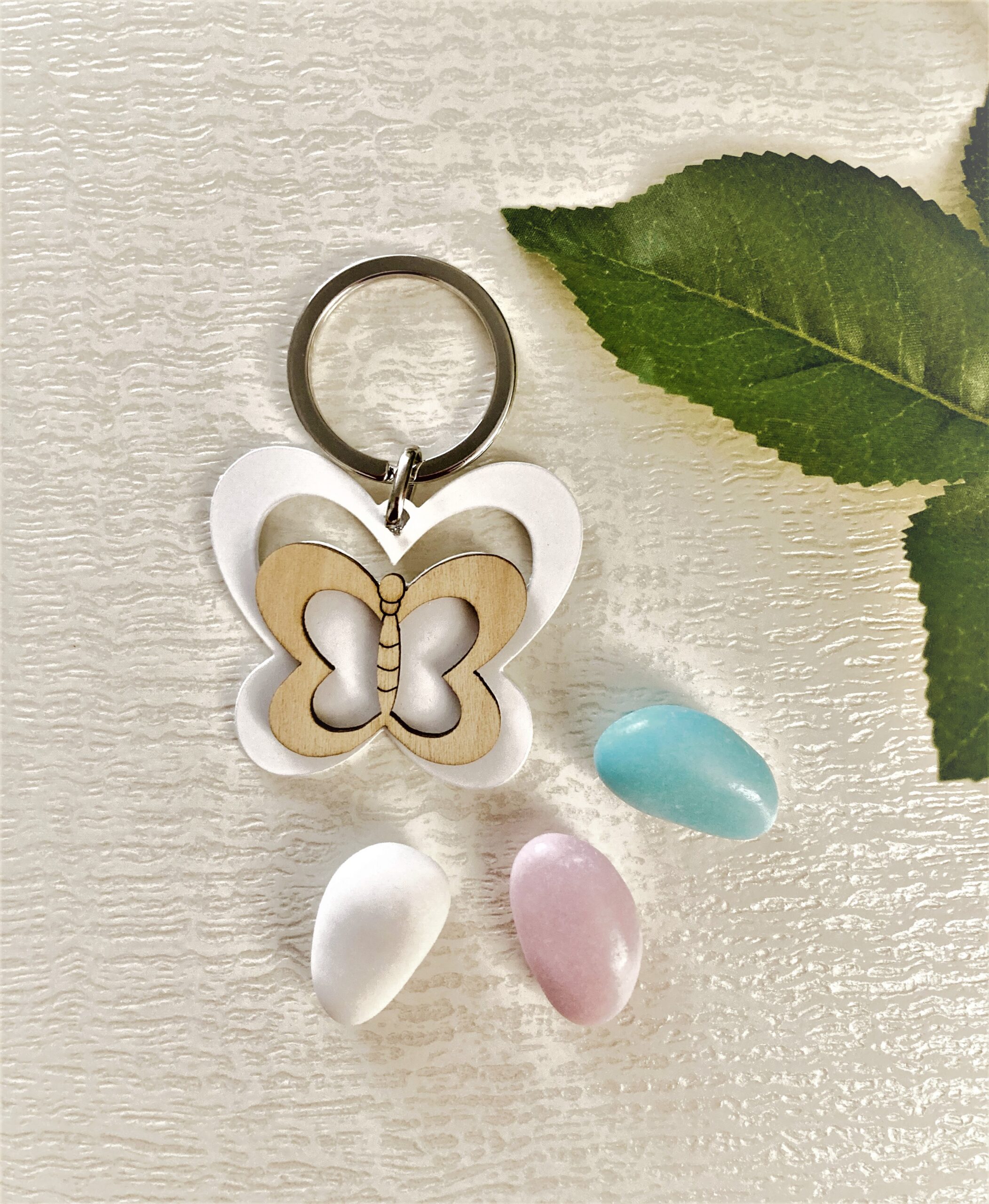 Elegante portachiavi con due farfalle, una in metallo bianco e una in legno. Ideale come accessorio per bomboniere di qualsiasi evento.