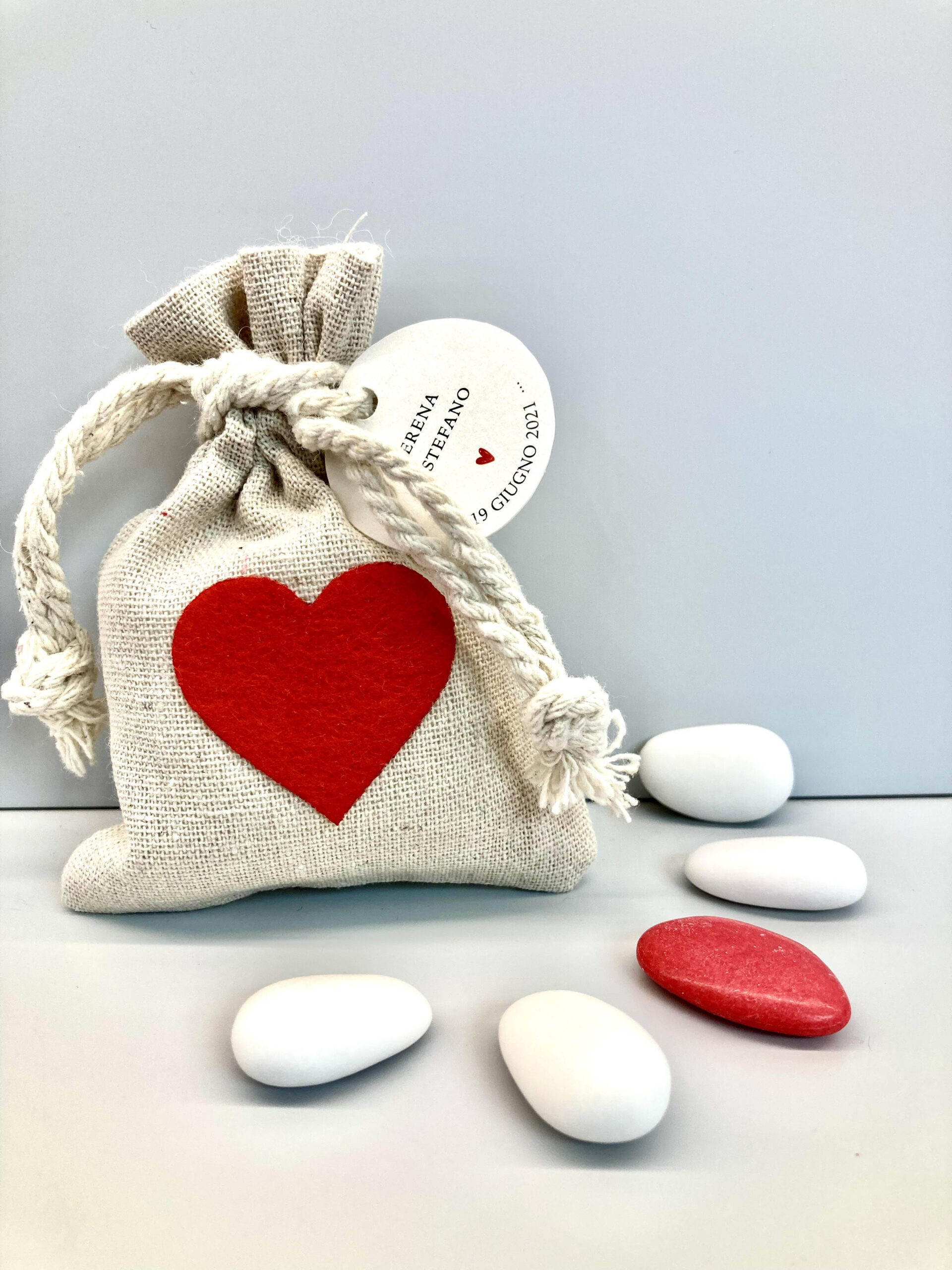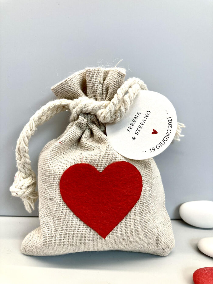 - Colore: sacchetto naturale, in stoffa tipo lino, con cuoricino in feltro rosso e laccetto autotirante per la chiusura.