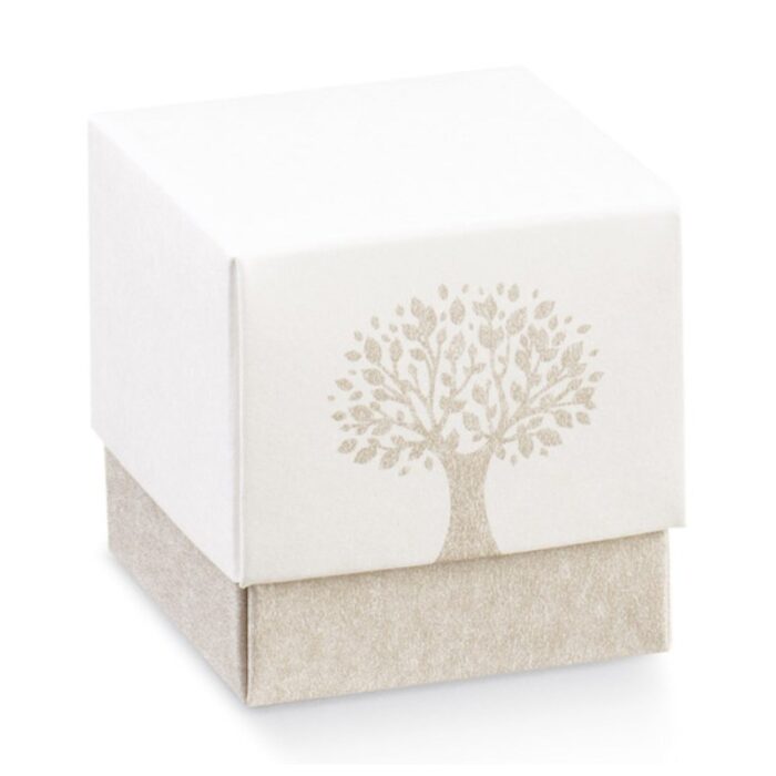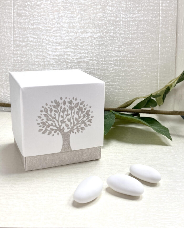 Scatolina-cubo porta confetti, in cartone, con albero della vita stampato, completo di bigliettino tondo personalizzato.