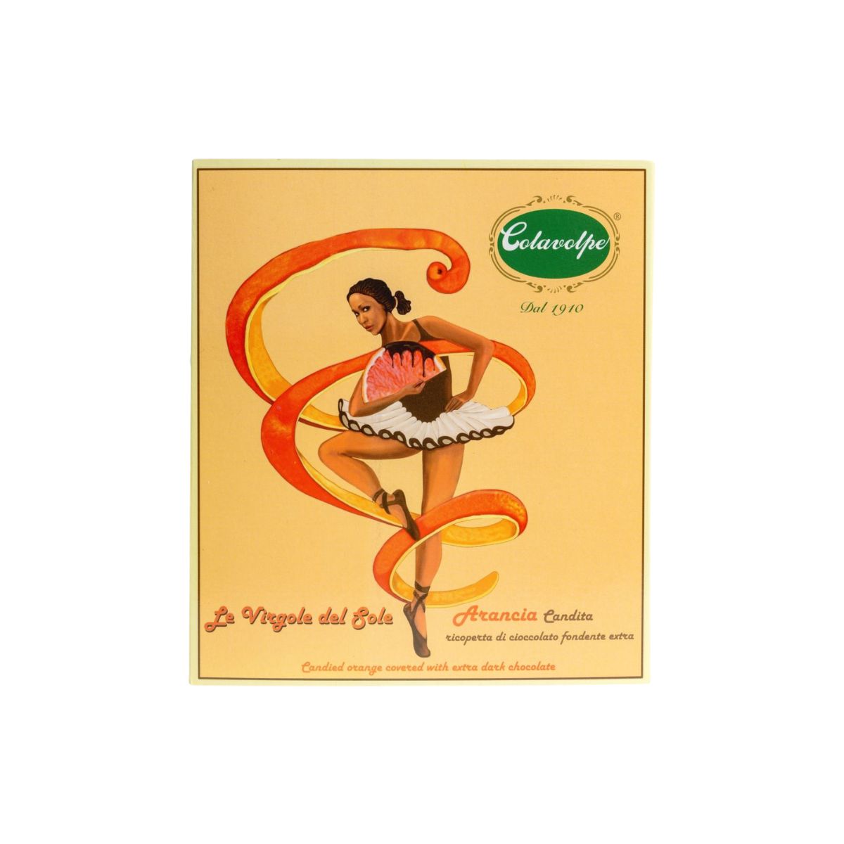 Filetti di arancia canditi e ricoperti di cioccolato fondente extra.