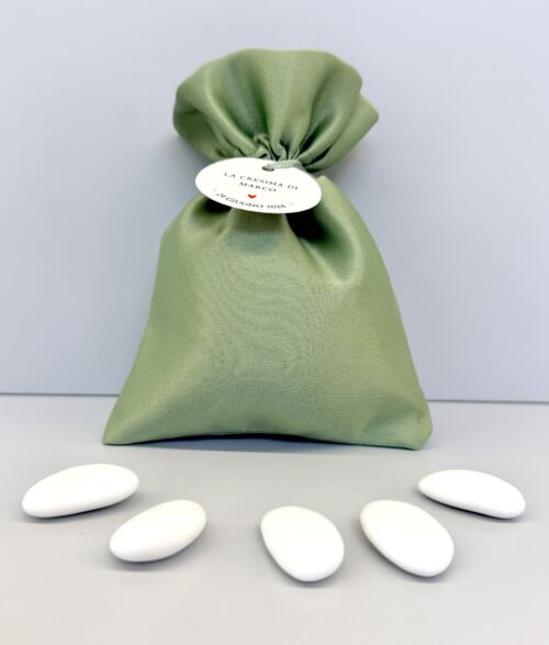 In ogni occasione importante della tua vita, puoi offrire un contributo concreto alla lotta contro i tumori del sangue, scegliendo le bomboniere solidali di AIL Roma. Sacchetto porta confetti, in tessuto color verde salvia, con cordino in cotone nella coulisse, per una chiusura rapida e comoda. Completo di bigliettino tondo personalizzato. Ordine minimo: 10 pezzi